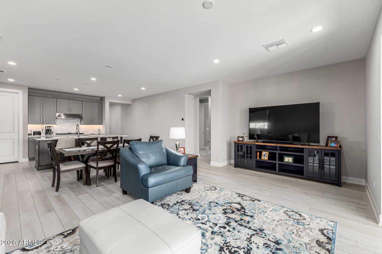 Beautiful home in Sterling Grove! Offering 3 beds + den, 2 baths + powder room, 2-car garage, & low-care landscape. Great curb appeal with a paver driveway, front porch, & artificial turf. The fabulous interior features tons of natural light, neutral palette, recessed lighting, and wood-look tile floors w/Berber carpet in bedrooms. Youll love the desirable open layout with multi-sliding doors to the back! The impressive kitchen boasts quartz counters, a walk-in pantry, gray shaker cabinets, tile backsplash, island w/breakfast bar, and SS appliances w/cooktop gas. Double-door den for an office! Large main bedroom has an ensuite with dual sinks & a walk-in closet. Secondary bedrooms share a Jack & Jill bathroom. Outback, you have a covered patio, extended pavers, & synthetic lawn. Just WOW!