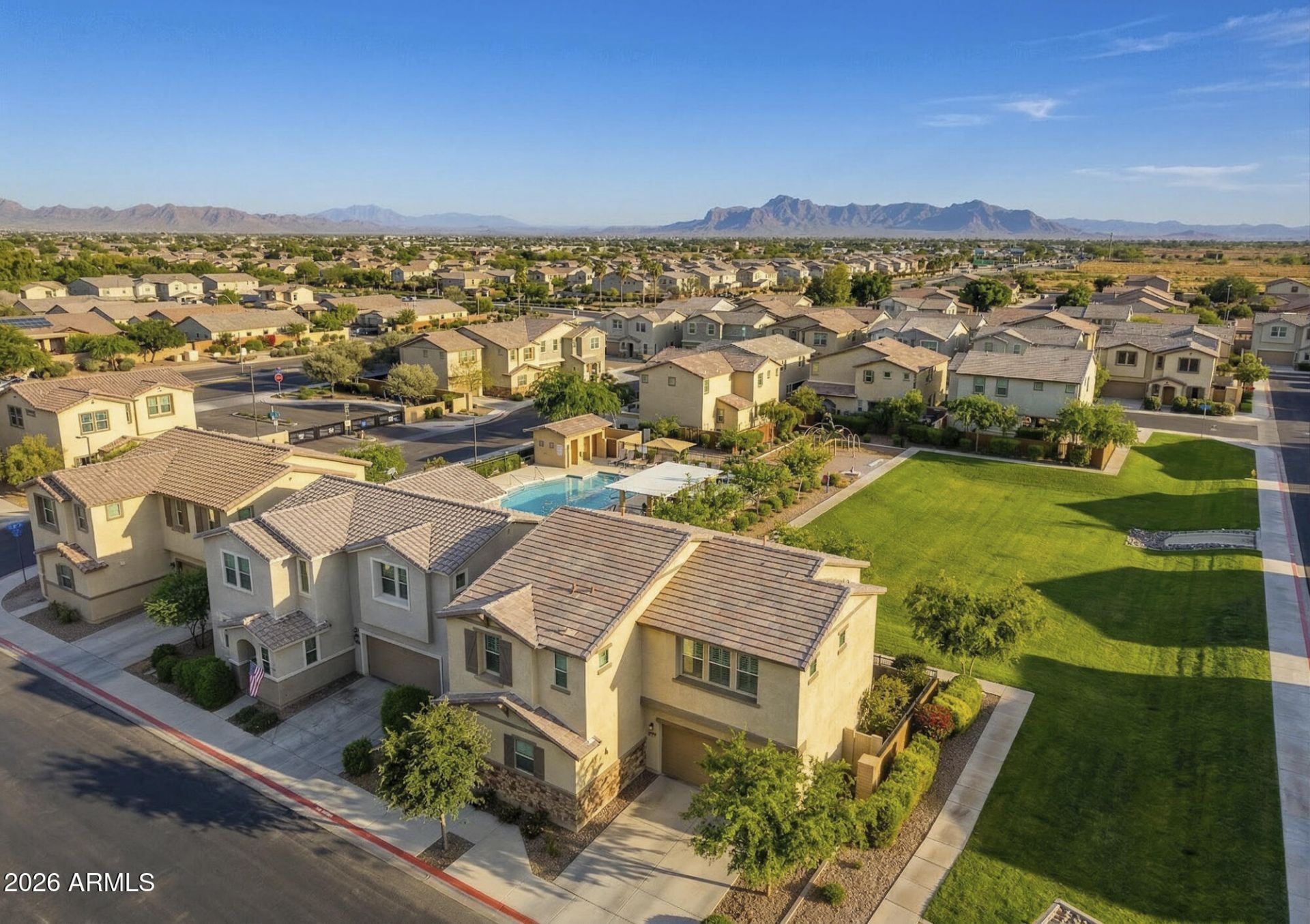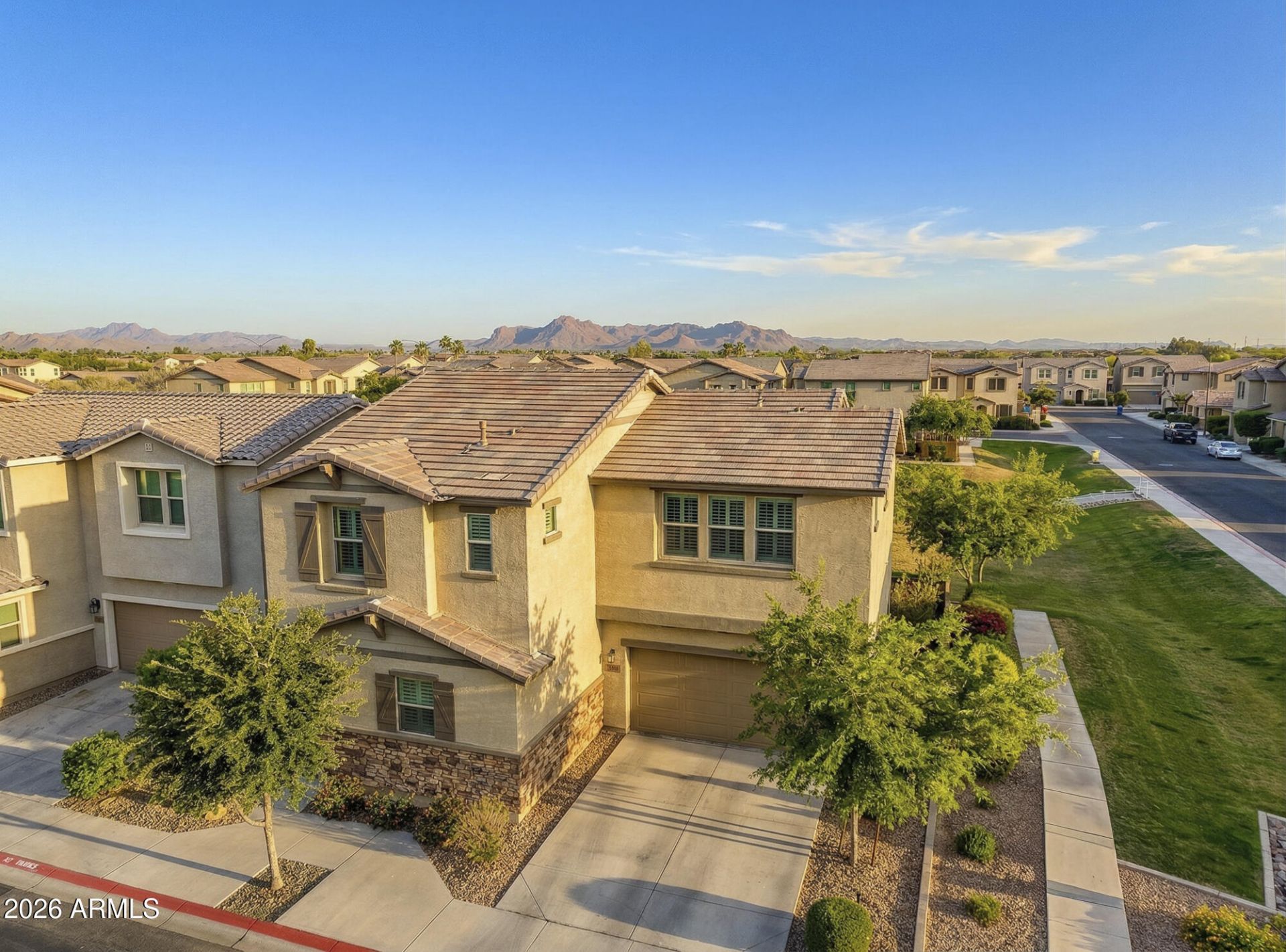 Welcome to this beautifully maintained, one-owner home in the exclusive gated community of Tavera South in Mesa. Built just six years ago and situated on a premium lot, this 4-bedroom, 2.5-bath residence offers exceptional privacy along with rare direct frontage to the community and resort-style pool--creating a setting where everyday living feels like a retreat.Step inside to an open and inviting floor plan thoughtfully designed for modern living. At the heart of the home is a chef-inspired kitchen featuring a large quartz island, elegant shaker cabinetry, stainless steel appliances, and designer backsplash. A soft, neutral palette enhances the space, creating a clean and timeless aesthetic.The open-concept layout allows the kitchen to flow gracefully into the living room perfect for refined entertaining and relaxed living. The main level is enhanced by rich wood-look plank tile flooring and elegant plantation shutters throughout.Upstairs, youll find 4 generously sized bedrooms, 2 bathrooms, and a thoughtfully designed laundry room with custom cabinetry. The owners suite is elevated with a generous walk-in closet, separate tub/shower, and a dual vanity. Spacious secondary bedrooms offer comfort and functionality, each complete with ample closet space.Step outside to a private paver patio with view fencing overlooking open green space. Low-maintenance turf and an automatic shade create the perfect blend of comfort, privacy, and outdoor enjoyment.Residents of Tavera South enjoy a low-maintenance lifestyle with exclusive access to private amenities, including a pool and spa, ramada, and tot lot--all within a secure and peaceful gated setting.Ideally located near top-rated schools, recreation, and dining, with easy access to major freeways, this home offers the perfect balance of luxury, comfort, and convenience.