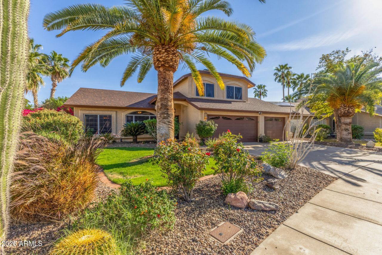 Extensively updated home in Pinnacle Peak Crossing with major renovations completed in 2019. Improvements include updated electrical, plumbing, drywall, insulation, roof, and dual high-efficiency Trane HVAC systems, along with new dual-pane windows and upgraded ventilation for improved comfort and efficiency.Interior finishes feature hardwood flooring, custom baseboards, Santa Fe wall texture, and travertine accents throughout arches, fireplace, and bathrooms. The kitchen includes maple cabinetry, Enigma Leather quartzite countertops imported from Brazil, Bosch appliances, and a ZLINE gas cooktop.The primary suite offers a custom double travertine shower with oil-rubbed bronze fixtures. Additional features include ceiling fans throughout, genuine wood blinds, upgraded lighting, and optimized HVAC vent placement.The property offers a five-car garage configuration, including a three-car garage plus a two-car tandem space suitable for additional vehicles, storage, or workshop use.The backyard provides mature landscaping, paver walkways, and a diving pool with updated equipment and refreshed Kool Deck, creating a private outdoor setting.Well-maintained and thoughtfully upgraded home in an established North Phoenix neighborhood.