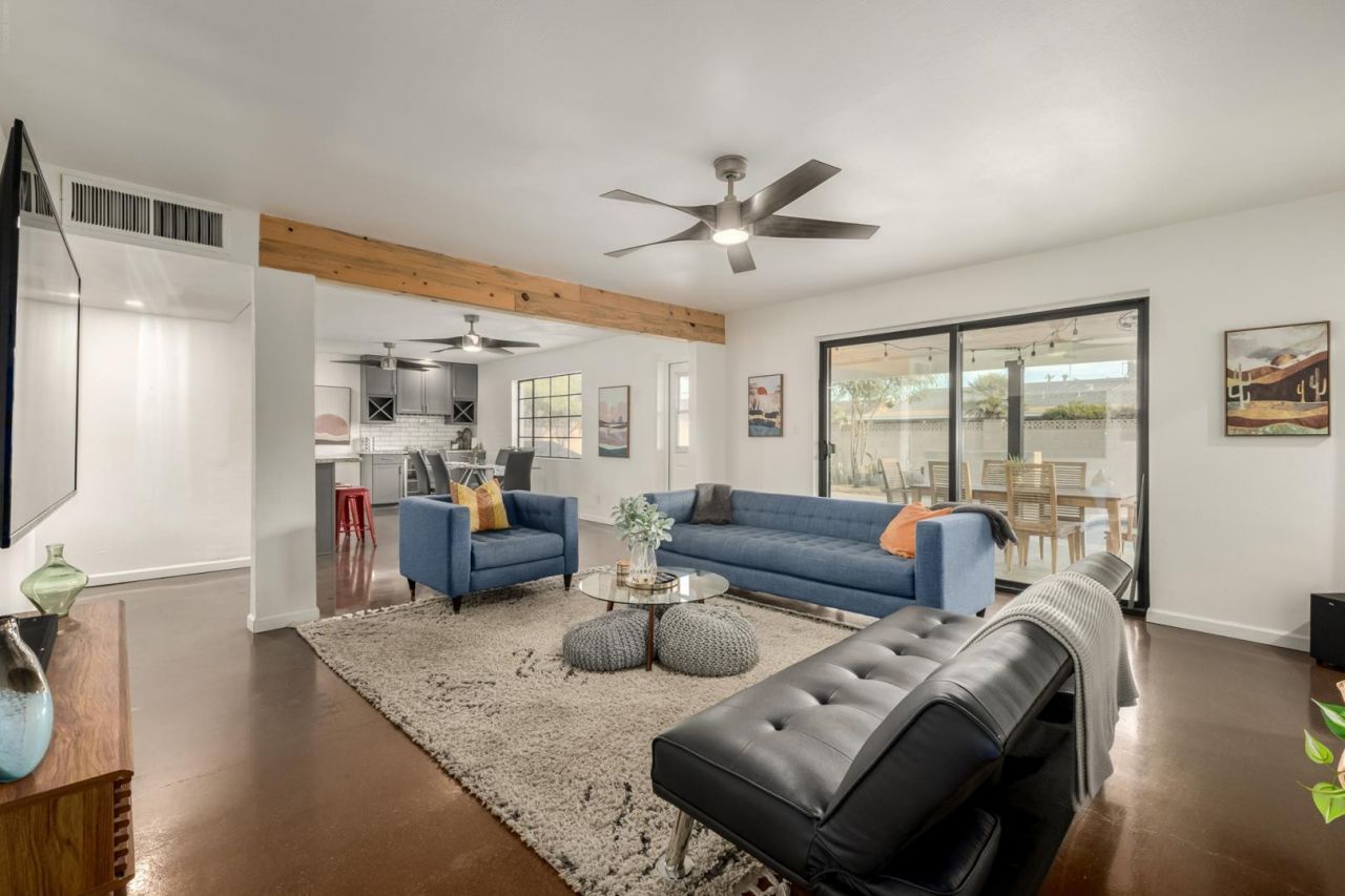 Located in a quiet neighborhood, yet close to it all, this exceptional property presents a unique opportunity for a residential home or a lucrative Airbnb investment. With glimpses of Camelback Mountain, this home is ideally situated near Old Town Scottsdale, walking paths, golf courses, parks, and highways. This impressive 5-bedroom, 3-bathroom property boasts a split floor plan & single-level design. The beautifully remodeled kitchen is filled with natural light and features granite countertops, stainless steel appliances, & new cabinetry which opens up to the eating area & great room. Additional highlights include remodeled bathrooms & polished concrete flooring. The sparkling pool has been resurfaced with pebble-tec and features a new pump, gas line, & pool heater.The exterior patio features a tongue-and-groove ceiling with string lights and an open-air casita, creating an ideal retreat. This property also features a new 200 Amp electrical panel with updated wiring throughout the home, as well as a new heating and cooling system. The newly installed pavers and turf enhance the propertys curb appeal, inviting you to experience the best of Scottsdale living.