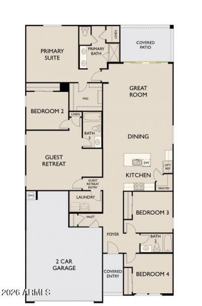 Welcome to the stunning Sunflower Floorplan! This beautifully designed home features 4 spacious bedrooms, 3 full bathrooms, and a private guest retreat--perfect for multigenerational living or hosting visitors. Thoughtfully laid out with a split floorplan, it offers both privacy and open, functional living spaces. With 2,219 sq ft of well-designed living space and a 2.5-car tandem garage, this home blends comfort, versatility, and style.The Spanish-style exterior creates timeless curb appeal, ideally situated on a desirable end homesite across from a green space. Inside, soaring 9-foot ceilings and 8-foot doors enhance the homes bright and open feel. The expansive great room is a standout feature, complete with a 4-panel center sliding glass door that opens to the backyard--perfect for seamless indoor-outdoor living. The open-concept design connects the kitchen, dining, and living areas for effortless entertaining and everyday living.The Sunflower showcases a sleek, modern aesthetic with gray 42-inch shaker-style cabinets paired with upgraded matte black hardware throughout. The kitchen features stylish white quartz countertops, a spacious island, and a classic white subway tile backsplash that brings a clean, timeless look to the space.Durable 7 x 22 gray wood-look tile flooring runs throughout the main living areas, offering both contemporary appeal and easy maintenance, while plush carpeting adds comfort to the bedrooms. The private primary suite serves as a relaxing escape, featuring dual sinks, white quartz countertops, matte black fixtures, and ample storage.The additional bathrooms continue the cohesive design with white quartz countertops and matching matte black finishes, creating a polished and modern feel throughout the home.Combining upgraded finishes, a flexible layout, and thoughtful design, this Sunflower home is ideal for those seeking modern living with added space for guests and everyday convenience.